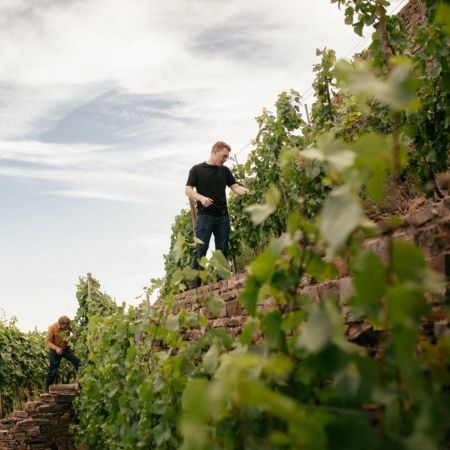 Daniel Fries is een aanstormend talent uit de noordelijke Terrassenmosel, nabij Koblenz. Als zoon van de wijnmakersfamilie Fries, die al generaties lang druiven verbouwt in Winningen, groeide hij letterlijk op tussen de steile leisteenterrassen van de Mosel. Na studies wijnbouw in Geisenheim en stages bij prestigieuze domeinen zoals Heymann-Löwenstein, Hubert de Montille (Bourgogne) en Lingua Franca (Oregon, VS), keerde hij in 2019 terug naar het familiebedrijf.